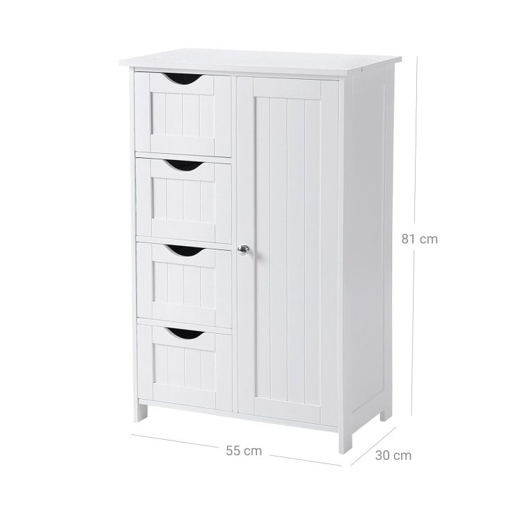 Rozmery 55 × 30 × 81 cm poskytujú dostatok priestoru bez toho, aby skrinka zaberala miesto navyše. Štyri praktické zásuvky sú ideálne na menšie veci, zatiaľ čo za dvierkami nájdete nastaviteľnú policu s možnosťou prispôsobenia pre vyššie aj nižšie predmety. Stabilná konštrukcia z MDF je pevná a dlhodobo odolná, navyše je vybavená bezpečnostným prvkom proti prevráteniu. Váži 13,7 kg, a napriek tomu sa vďaka kompaktným rozmerom hodí aj do menších priestorov.