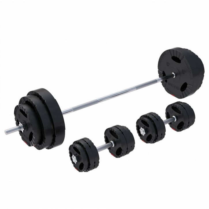 Technicky prepracované tyče s hviezdicovými zámkami umožňujú rýchlu výmenu kotúčov. Plastový plášť závaží chráni podlahu a žebrované úchopové plochy poskytujú stabilitu pri každom cviku. Sada je vhodná pre všetky kotúče s otvorom 30/31 mm a vďaka rozmanitosti závaží je ideálna pre začiatočníkov aj pokročilých.