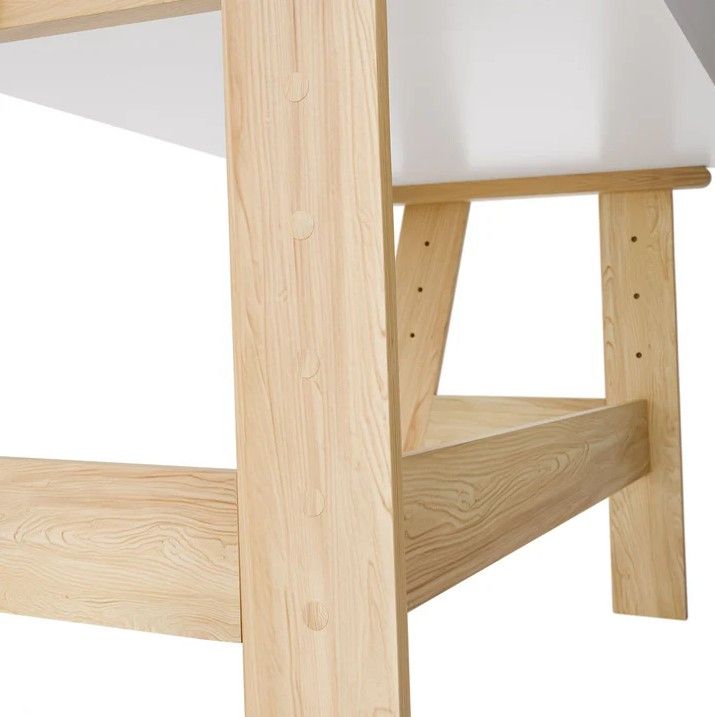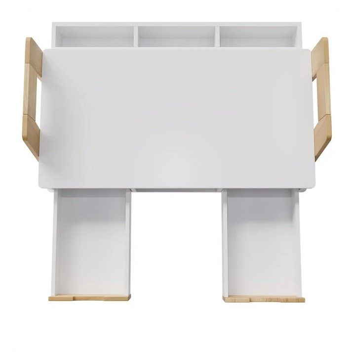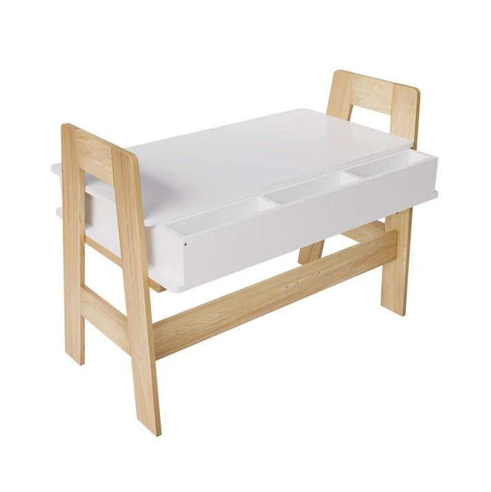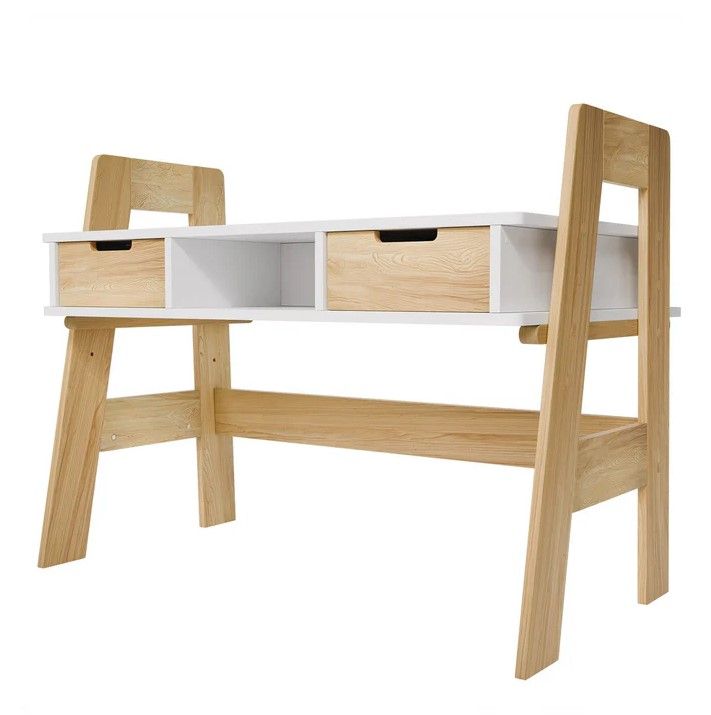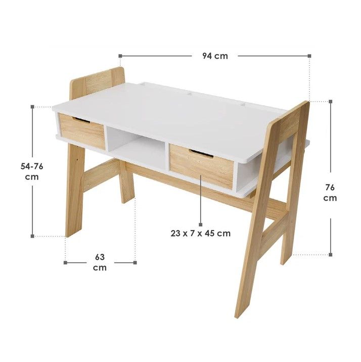 Stôl je vyrobený z robustného, melamínom potiahnutého dreva, čo zaisťuje dlhú životnosť a odolnosť proti poškriabaniu. Výškovo nastaviteľná konštrukcia umožňuje ľahké prispôsobenie rastu dieťaťa. Dve zásuvky a štyri priestranné priehradky poskytujú dostatok miesta na školské potreby aj hračky.