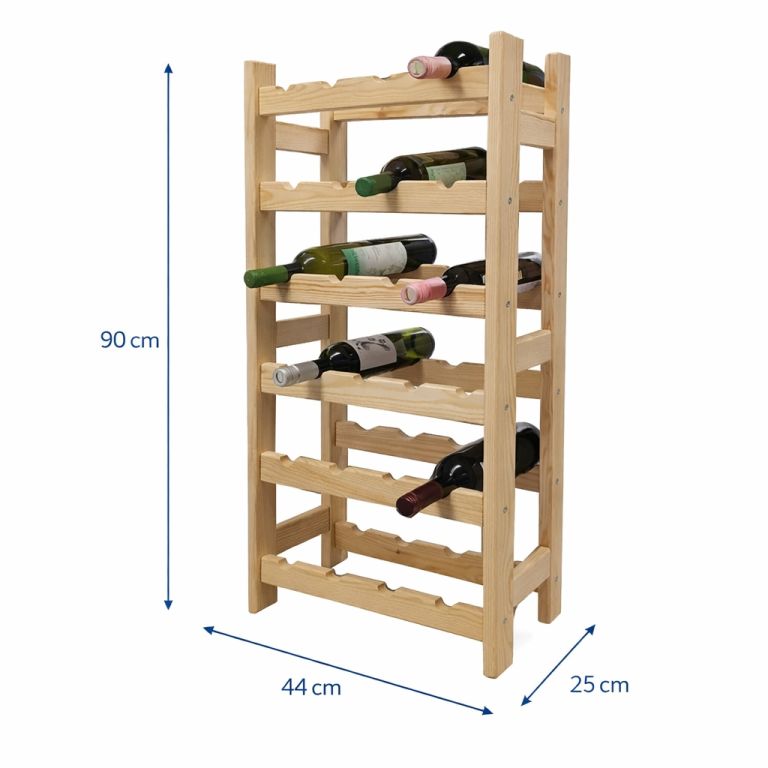 Stojan je vyrobený z borovicového dreva s hrúbkou 2 cm a všetky hrany sú zaoblené pre bezpečnú manipuláciu. Každá fľaša má svoje vlastné miesto, takže uložené fľaše sú stabilné a prehľadne usporiadané. Dodáva sa v rozloženom stave pre ľahšiu prepravu. Povrch nie je upravený, takže vynikne prirodzená kresba dreva a stojan si môžete podľa potreby dotvoriť vlastným náterom. Pre domáce archívy, pivnice aj menšie vinotéky je to jednoduché a poctivé riešenie, ktoré vydrží.
