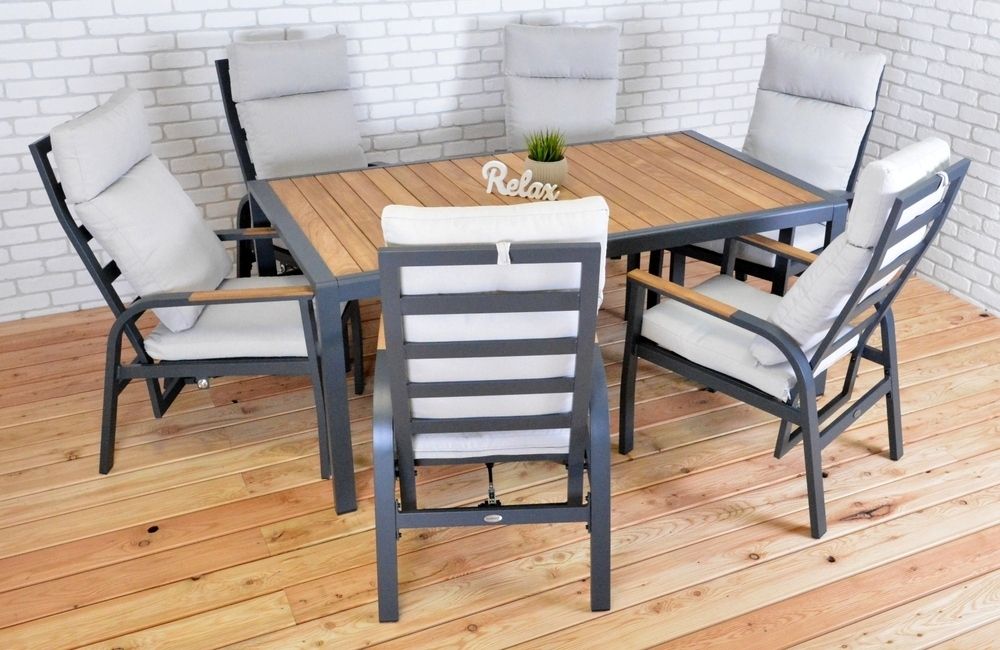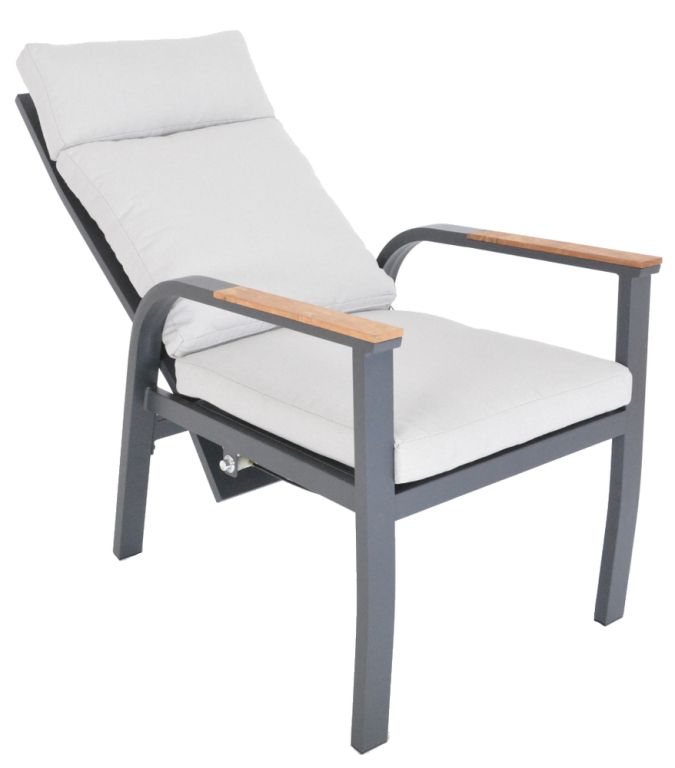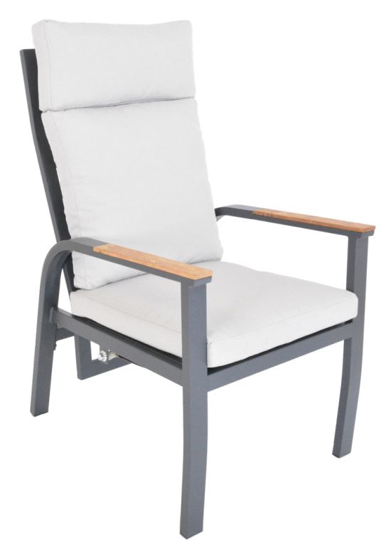 Luxusné hliníkové kreslá v grafitovom vyhotovení, doplnené teakovými podrúčkami. Veľmi pohodlné polyesterové vankúše (250 g/m2) a vodu odpudzujúca tkanina s penovou výplňou (opierka chrbta 10 cm, sedadlo 5 cm) sú odolné voči UV žiareniu. Všetky vankúše sú vybavené zipsmi, vďaka čomu môžete polyesterový poťah ľahko odstrániť. Veľkou výhodou sú vysoké operadlá stoličiek, ktoré sa dajú aj nastaviť. To poskytuje priestor nielen na stolovanie, ale aj na veľmi pohodlný odpočinok. Vďaka použitým materiálom a modernému vzhľadu sú stoličky skutočne univerzálne a vhodné pre použitie v interiéri aj exteriéri – v záhradách, na terasách, v zimných záhradách alebo dokonca v recepčných priestoroch. Vďaka jednoduchému montážu budete môcť stoličky plne využívať v priebehu niekoľkých okamihov.