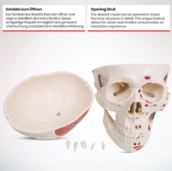Objavte fascinujúci svet ľudského tela s týmto anatomickým modelom v životnej veľkosti. Ideálny pre študentov, učiteľov aj nadšencov, ktorí chcú preniknúť do tajov anatómie a pochopiť, ako funguje naše telo. Model je skvelým pomocníkom pri štúdiu aj prezentácii, inšpirovaný skutočnou ľudskou kostrou s detailne vyznačenými svalmi a šľachami.