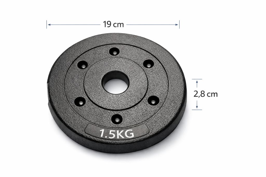 - kotúče - priemer / hrúbka: 1,25 kg (17,5 cm / 2,6 cm), 1,5 kg (19 cm / 2,8 cm), 2 kg (19,5 cm / 3,2 cm)