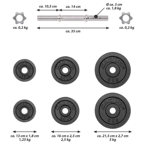 Súprava obsahuje jednu 35 cm činku s priemerom 30 mm, hmotnosťou činky cca 1,8 kg, dva skrutkové uzávery, dva 5 kg kotúče, dva 2,5 kg kotúče a dva 1,25 kg kotúče – celkom 20 kg záťaže. Vďaka variabilite záťaže je ideálna na rozšírenie vášho tréningu, od posilňovania paží až po komplexné posilňovanie celého tela.