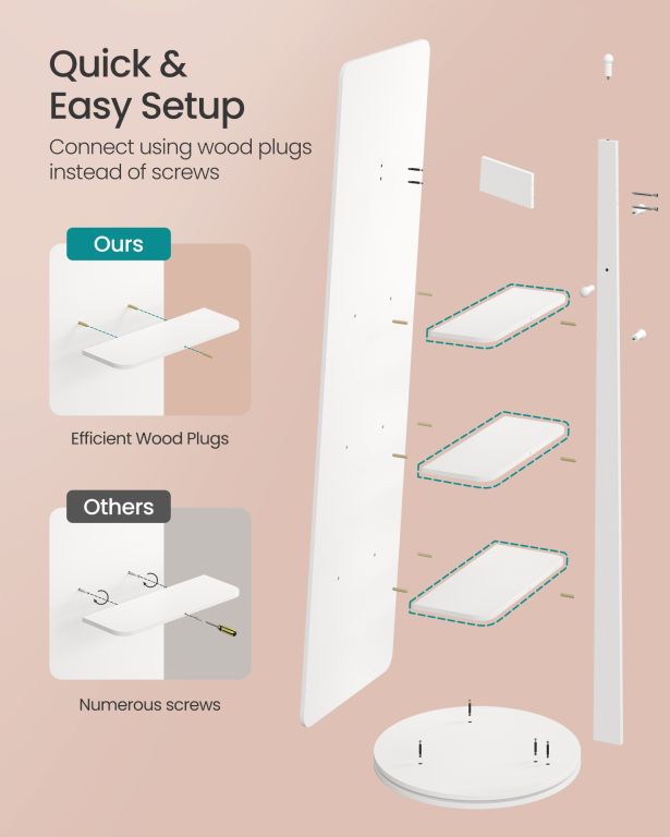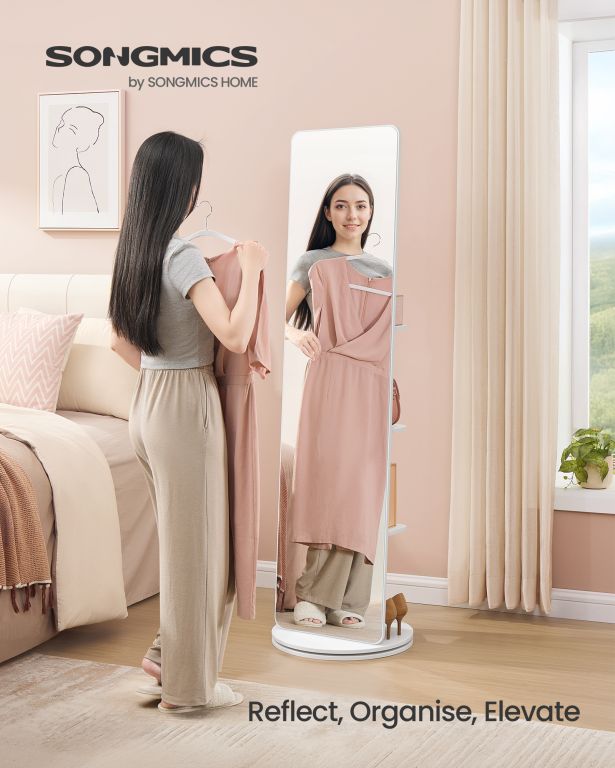 Objavte kombináciu štýlu a praktickosti v jednom produkte. Toto vysoké zrkadlo s minimalistickým dizajnom a čistou bielou farbou dokonale doplní vašu spálňu, chodbu alebo šatník. Všetko, čo potrebujete, máte vždy po ruke vďaka 4 policám a 4 háčikom na zadnej strane. Otočný mechanizmus vám umožňuje ľahký prístup ku všetkým uloženým veciam a zároveň si môžete vychutnať perfektný pohľad na celé svoje oblečenie.