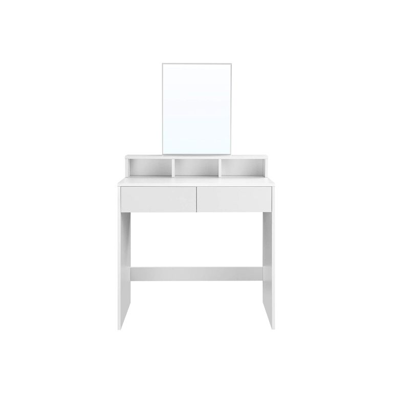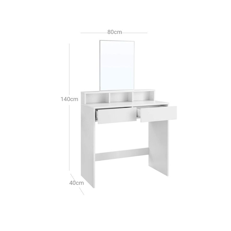 Začnite svoj deň s úsmevom a pohodlím pri modernom toaletnom stolíku VASAGLE. Priestranné zásuvky a otvorené priehradky vám umožnia mať make-up, parfémy aj doplnky vždy na dosah ruky. Veľké obdĺžnikové zrkadlo a elegantný biely dizajn dodajú vašej spálni svieži a upravený vzhľad.