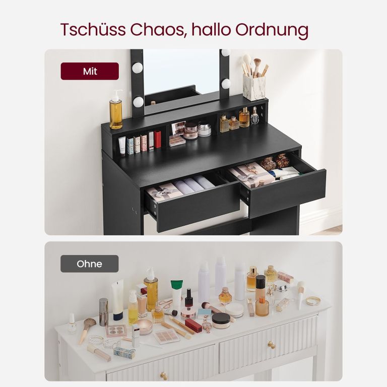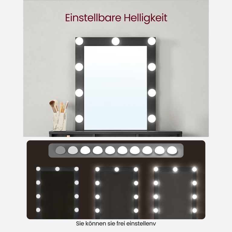 Premeňte svoju každodennú rutinu líčenia na zážitok s týmto moderným toaletným stolíkom s LED osvetlením. Deväť nastaviteľných svetiel vám umožní nájsť ideálnu jasnosť pre dokonalé nanášanie make-upu, zatiaľ čo vďaka premysleným úložným priestorom bude všetko pekne na svojom mieste. Elegantný čierny dizajn doplní každý interiér a stane sa vaším obľúbeným kútikom krásy.