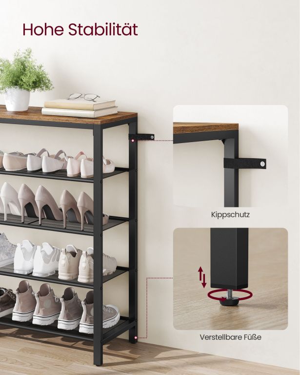 Váš domov si zaslúži nielen poriadok, ale aj štýl. Botník VASAGLE kombinuje rustikálne hnedé drevo s čiernym oceľovým rámom a prináša do predsiene industriálny nádych. Štyri vzdušné kovové police pojmú obuv celej rodiny, zatiaľ čo horná doska poslúži na tašku, kľúče alebo dekorácie.
