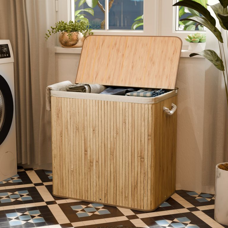 Vneste do svojho domova poriadok a štýl so 150-litrovým bambusovým košom na bielizeň. Vďaka svojmu prírodnému vzhľadu sa stane elegantným doplnkom kúpeľne alebo spálne a zároveň skrytým úložným priestorom pre všetku vašu bielizeň. Tri samostatné priehradky umožňujú okamžité triedenie bielej, tmavej a farebnej bielizne, vďaka čomu je pranie rýchlejšie a prehľadnejšie.