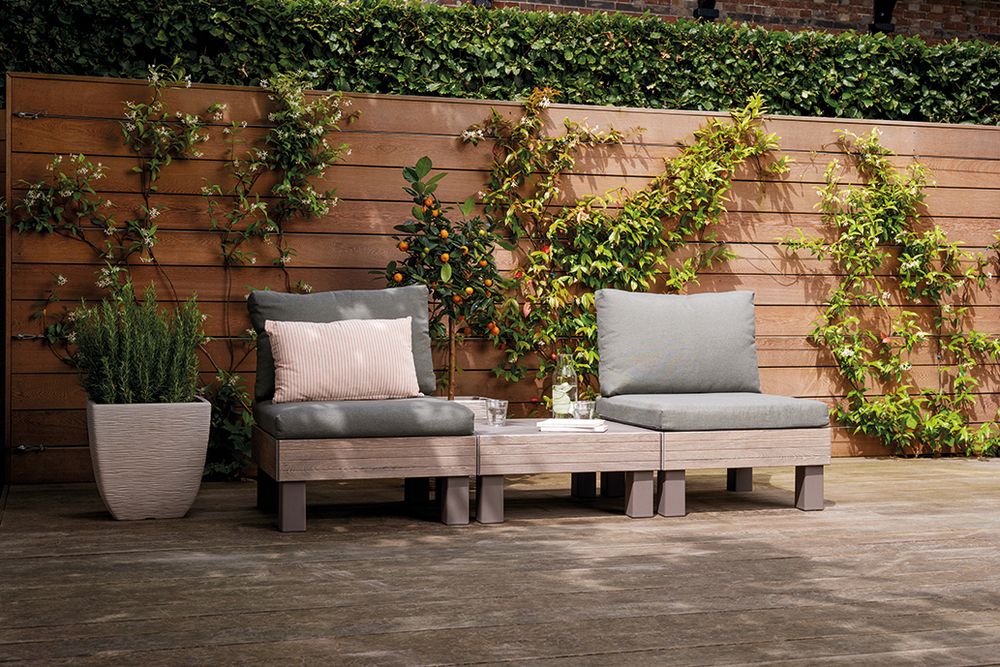 Tvrdý lisovaný plast v dizajne dreva je odolný voči poveternostným vplyvom a UV žiareniu. Montáž je rýchla a jednoduchá, údržba nenáročná a vďaka kompaktným rozmerom sa súprava ľahko skladuje. Kovové spojovacie prvky zaisťujú stabilitu a dlhú životnosť celého posedenia.