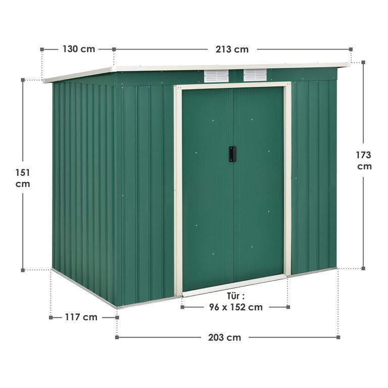 Stabilná konštrukcia z pozinkovaného plechu zaisťuje dlhú životnosť a minimálnu údržbu. Pultová strecha a základový rám uľahčujú montáž a chránia obsah pred vlhkosťou aj nečistotami.